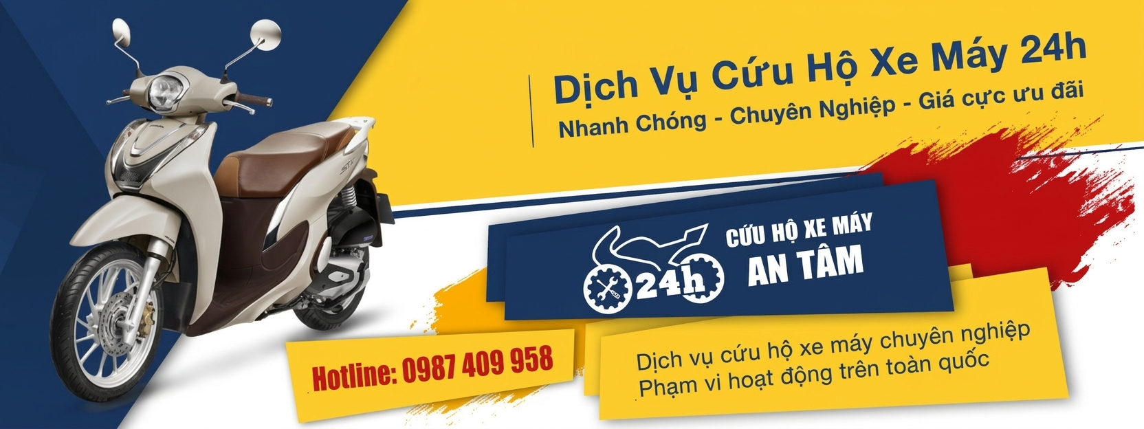Chào bạn đến với Cứu Hộ XE MÁY CHUYÊN NGHIỆP , Dịch vụ cứu hộ xe máy chúng tôi có mặt sau 15 phút ,Với đội ngũ nhân viên đông đảo cùng đội thợ tay nghề cao sẵn sàng phục vụ các vấn đề về xe hư hỏng như lủng bánh, hết bình, ngập nước, thay ruột, chết máy. Với đội ngũ nhân viên sẵn sàng sửa xe máy tại chỗ, cứu hộ xe máy tận nơi, sửa xe máy lưu động 24/24